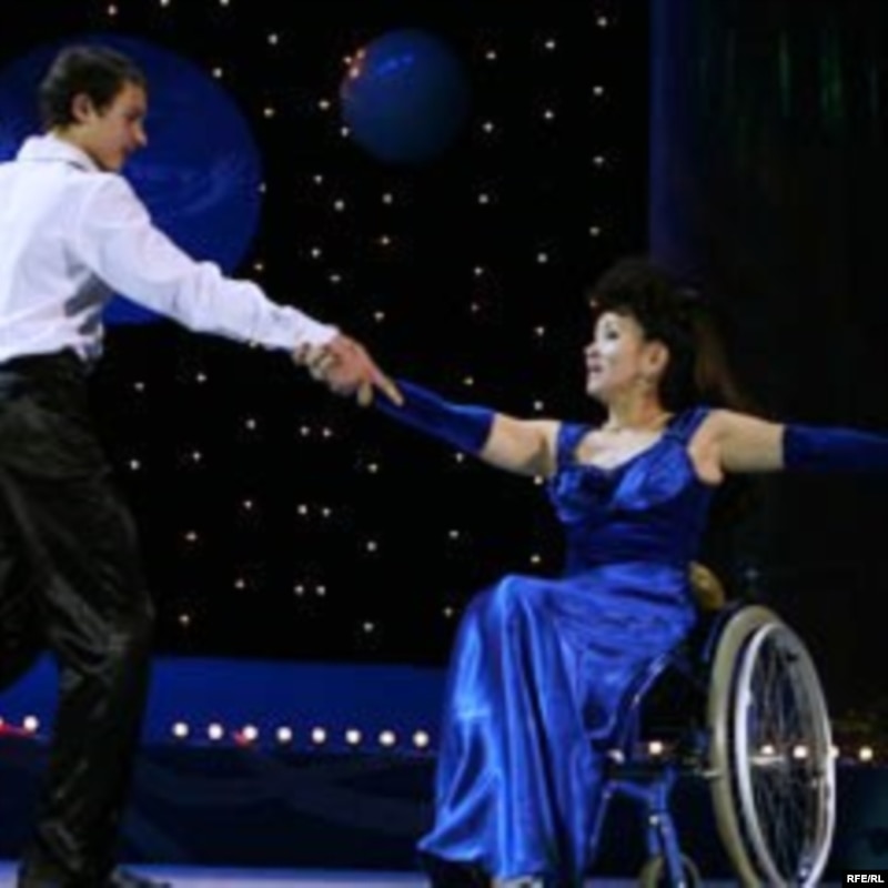Аруна Жақсығұлова (оң жақта) мен Олег Лазарев жұбы мүмкіндігі шектеулі жандардың республикалық бірінші би фестивалінің жеңімпазы атанды. Қостанай, 23 қыркүйек 2009 жыл.