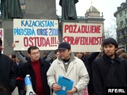 Чехиядағы қазақ босқындары Прага орталығындағы Вацлав алаңында митинг өткізуде. Прага, 7ақпан, 2009 жыл.