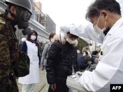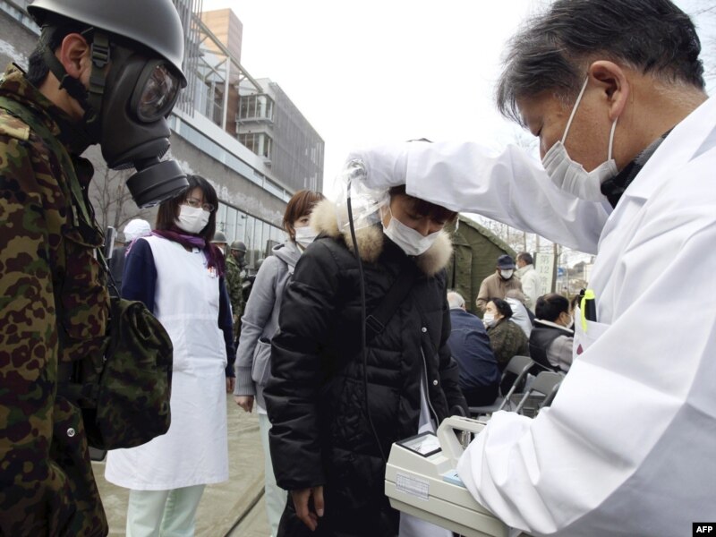 Дәрігер аман қалған тұрғындардың денесіндегі радиация мөлшерін өлшеп жатыр. Нихонмацу, Фукусима префектурасы, 13 наурыз 2011 жыл